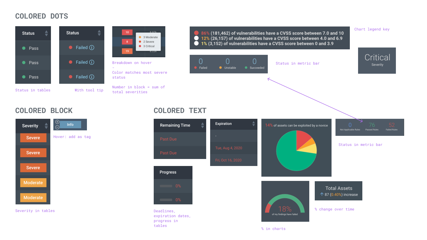 Currently InsightVM had an inconsistent view of status and severity. We already had various representation depending on the designer. There was low value in adding another variation unless there was a good reason. I wanted keep the same representation for risk models for a consistent experience. This led me to audit the current experience.