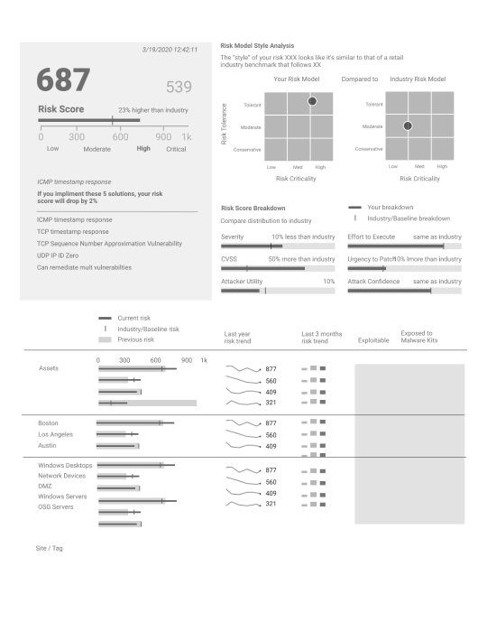 For Assets, we needed to show how a criticality tag influenced the score. Influences of vulnerability score were capability, intent, and CVSS score. A remediation solution should clarify the affected assets, associated vulnerabilities, and impact. Customers wanted to see impactful actions prioritized by the highest risk score. With the team, we defined scope and prioritization pending on the version of the design.