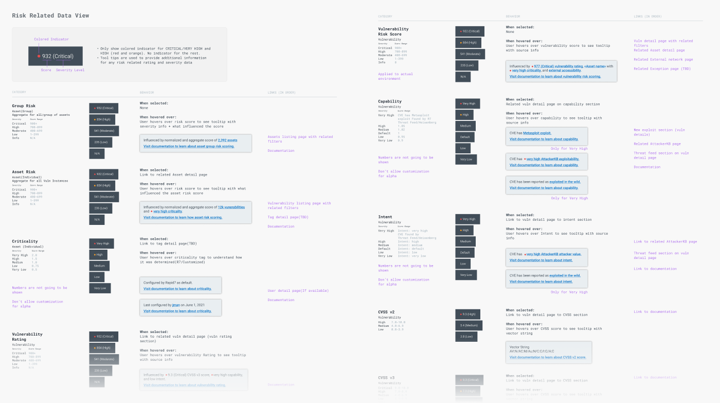 I focused on the risk content and location to map how risk fits into the InsightVM ecosystem. I audited our product to find what areas we could expose this new risk information. This helped to keep track of how the content could apply pending on context of the entity. Mindful of the design debt, I focused on understanding the content relationship. A content-first approach would prevent the creation of silos and redundant duplicity.